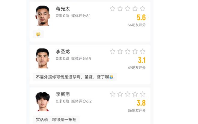 最后就是李圣龙,作为本场比赛的单箭头,他在出战半场的情况下,李圣龙不仅没有一脚射门,而且丢失球权数也是达到了6次,这也导致李圣龙在赛后评分时仅仅获得3.1分,而在赛后,也是有球迷向李圣龙提出了质疑:不靠外援你倒是进球啊!