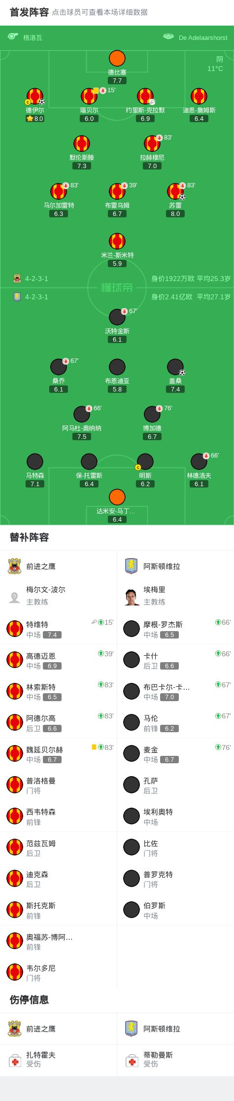北京时间10月24日欧足联欧洲联赛 联赛阶段 第3轮,前进之鹰对阵阿斯顿维拉。上半场盖桑开场闪击,半场尾声特维特开出任意球,苏雷折射破门扳平比分。下半场约里斯-克拉默助攻德伊尔破门反超比分,之后布恩迪亚将点球踢飞。最终维拉客场1-2不敌前进之鹰。