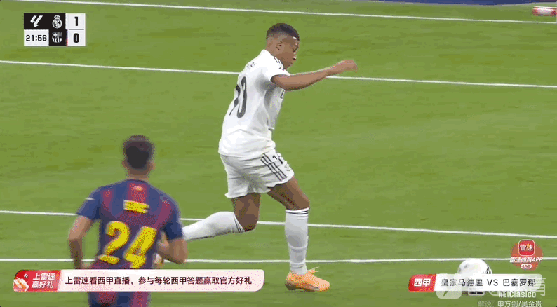 雷速体育10月26日讯 西甲第10轮,西班牙国家德比,皇家马德里坐镇主场伯纳乌迎战巴塞罗那。比赛第22分钟,姆巴佩接贝林厄姆直塞先拔头筹。